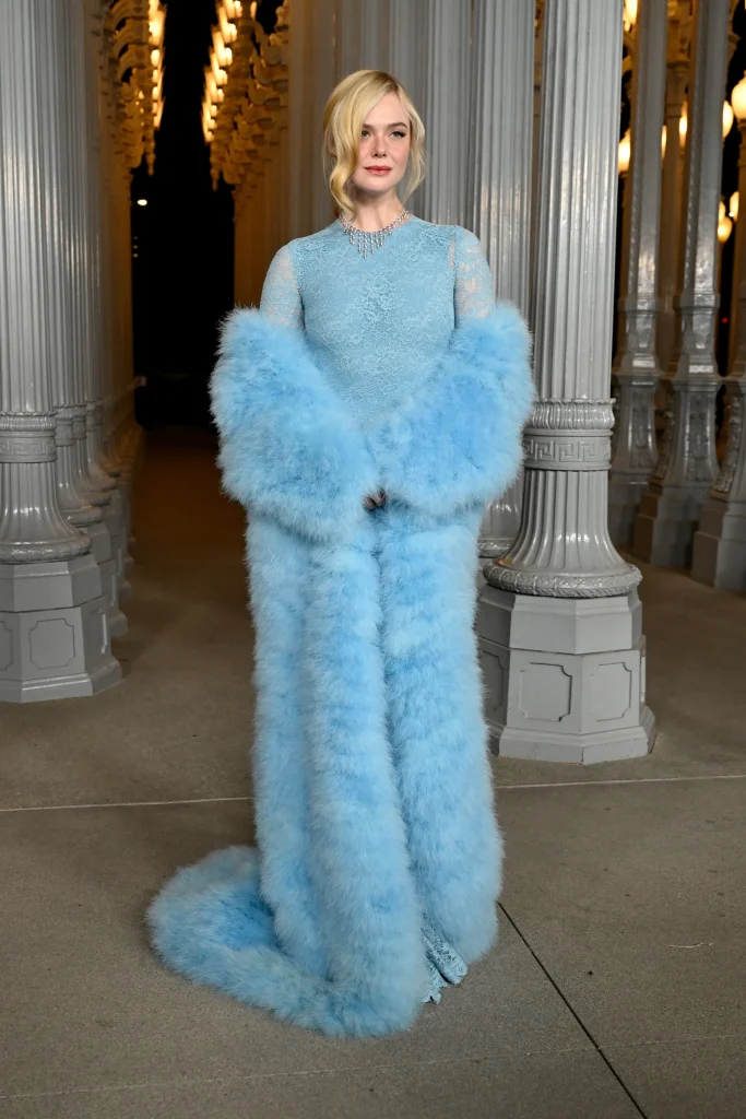 Elle Fanning embraced whimsical glamour with her dreamy baby-blue Gucci look. Known for her ethereal fashion sensibilities, Fanning leaned into soft textures and feminine shapes.