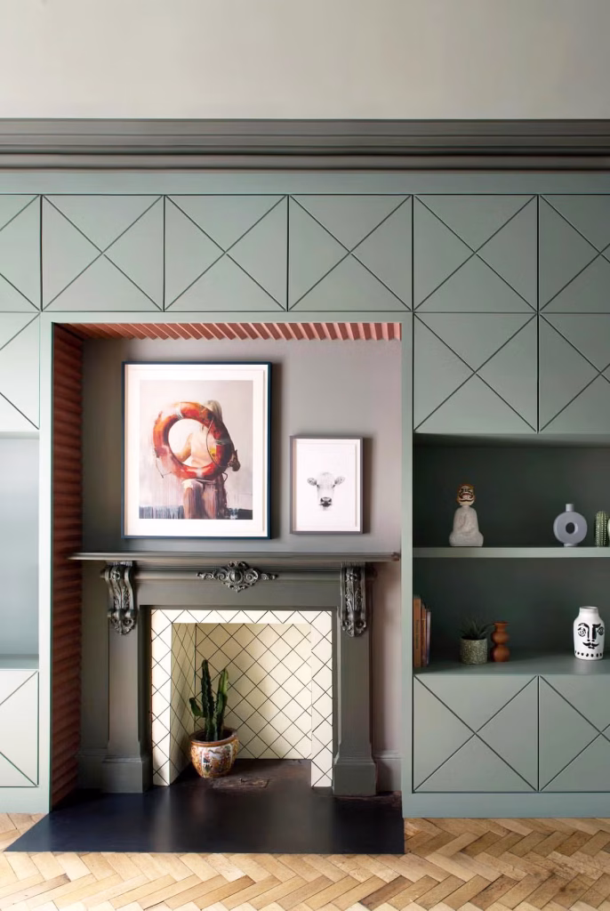Kingston Lafferty Design blends old and new by pairing an ornate Victorian mantel with a bold, geometric tiled fireplace. A cactus placed in the niche adds life and purpose, tying the hearth to the room’s modern design elements.