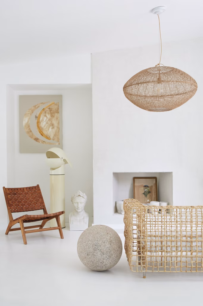 Interior designer Leanne Ford transformed an empty fireplace into a mini gallery, showcasing pottery and artwork. This approach adds visual interest and makes the fireplace a curated focal point in a texture-rich, stylish space.